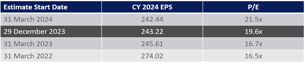 It is often said “earnings are the mother’s milk of bull markets.” Yet while the Wall Street consensus for 2024 S&P 500 earnings has declined 12% from two years ago, the index has gained 18% during this period. An expansion of the price to earnings (P/E) multiple, which is at 21X versus 17X two years ago, has fueled this rise.